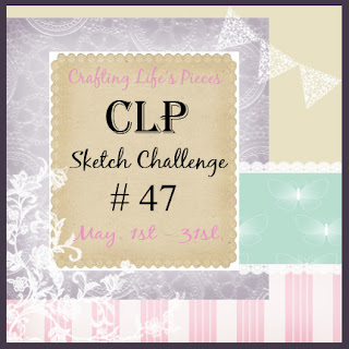 My card is a Mother's Day card for my own mom! I've used Easter Pinkette Daisy August from Tickled Pink Stamps and paired her with this month's sketch from Crafting Life's Pieces (#47). Both were a lot of fun to work with! August is my favorite Pinkette. She reminds me of myself, I suppose. Papers are Basic Grey - Lemonade. I added flowers, a doily, and pearls in the center of the flower ribbon (for the bling). The pennant banner was created using the Banner Day Die-namics die from My Favorite Things. I placed some chipboard letters on top to spell "MOM". The border punch is a Martha Stewart one and no creation of mine is complete without Tim Holtz, right? lol The metal corner is his.